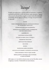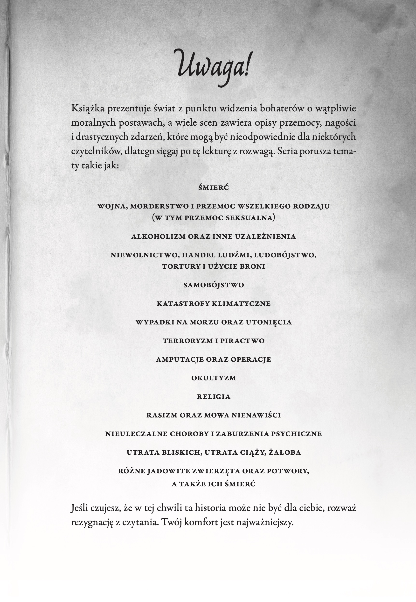 UWAGA: Książka prezentuje świat z punktu widzenia bohaterów o wątpliwie moralnych postawach, a wiele scen zawiera opisy przemocy, nagości i drastycznych zdarzeń, które mogą być nieodpowiednie dla niektórych czytelników, dlatego sięgaj po tę lekturę z rozwagą.
